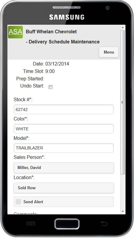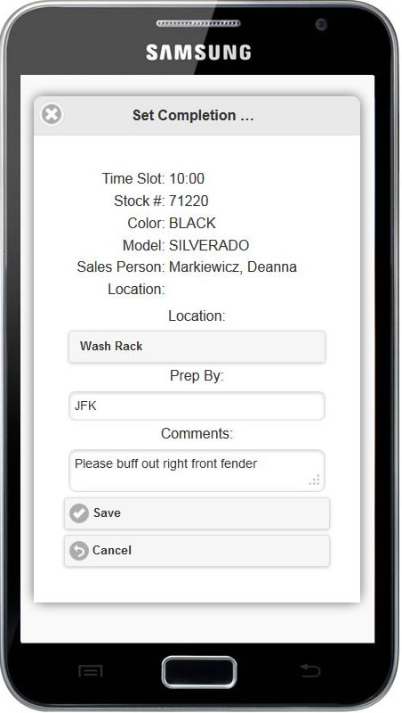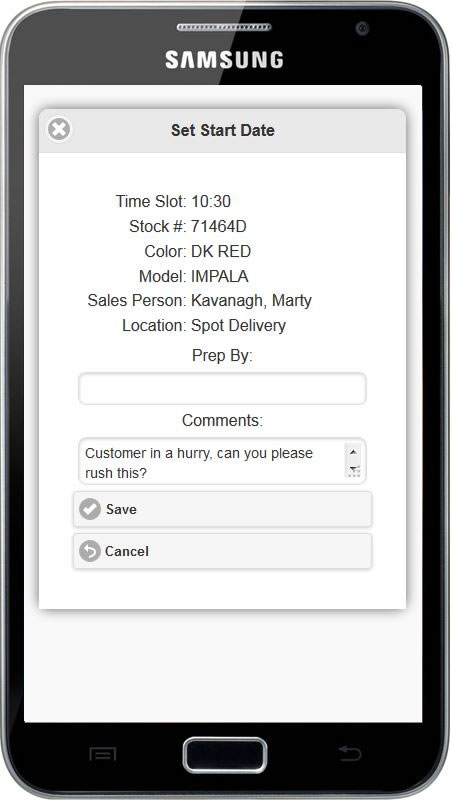 Each car listed on the Delivery Schedule is color coded for easy reference. Yellow - The prep department has started work, Red - The car preparation is running late, and Green - The prep department has completed the car.