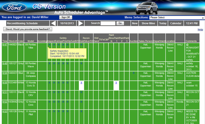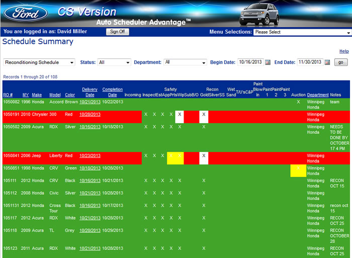 With the Reconditioning Schedule you can track every single used vehicle that has been traded in or purchased all the way from the time of the initial purchase/trade in, through used vehicle safety inspection & repair, the reconditioning process, body shop repairs, minor paint flaw repairs in multiple different repair facilities easily & efficiently from anywhere you have internet access.